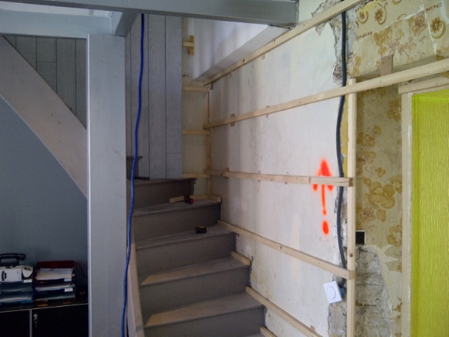Restauration d'un plafond avec lambris en medium revetu et intégration de spots LED